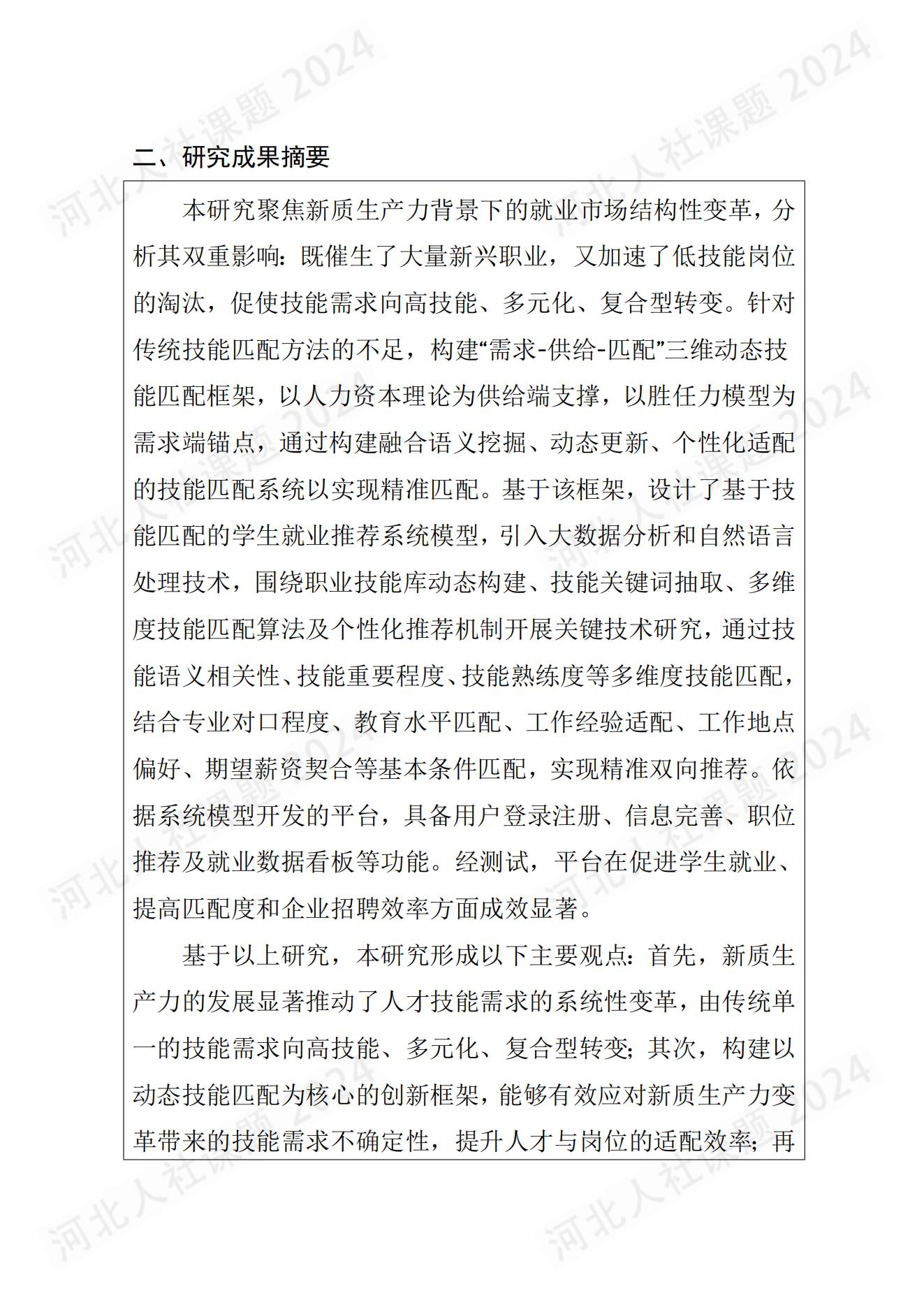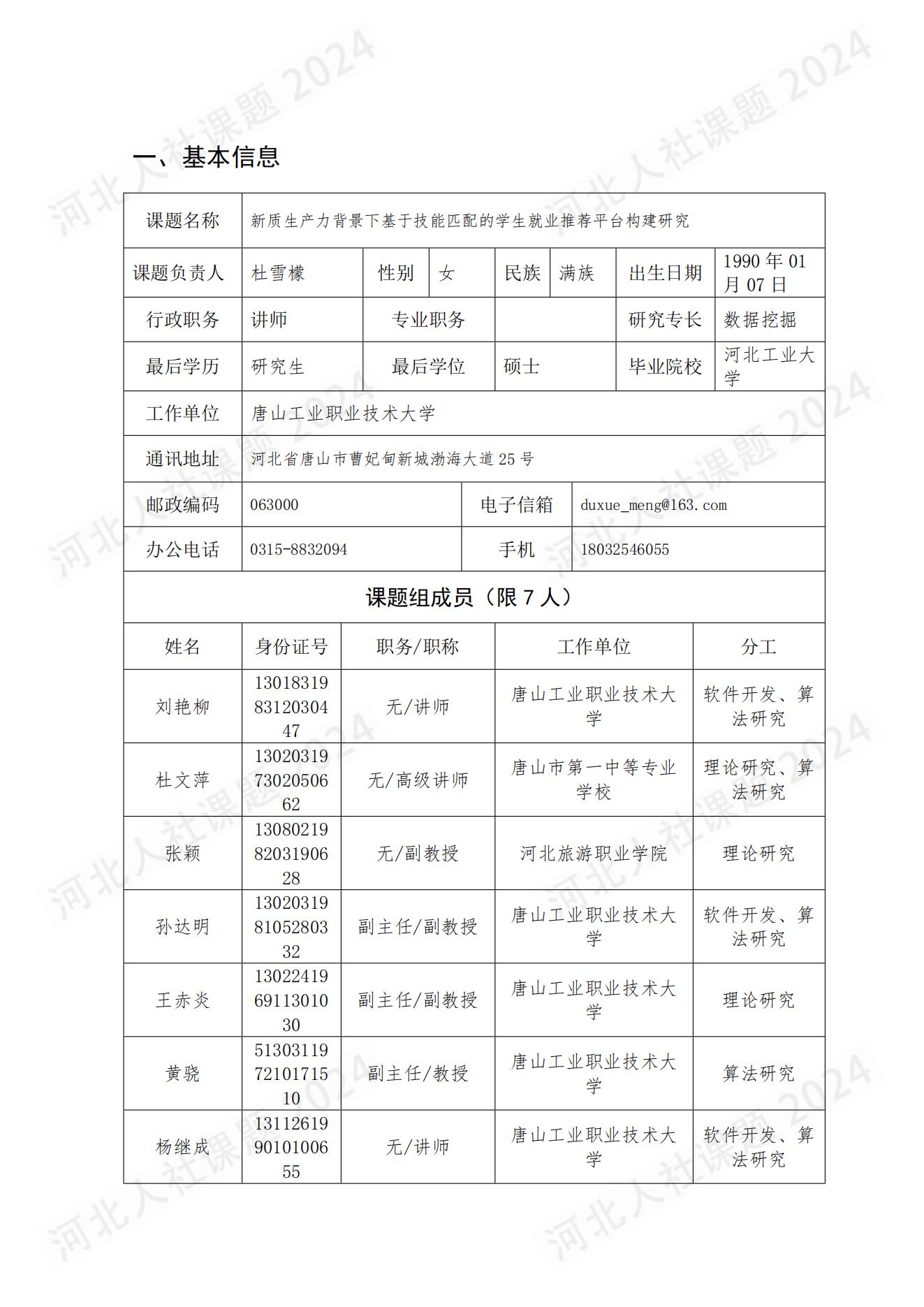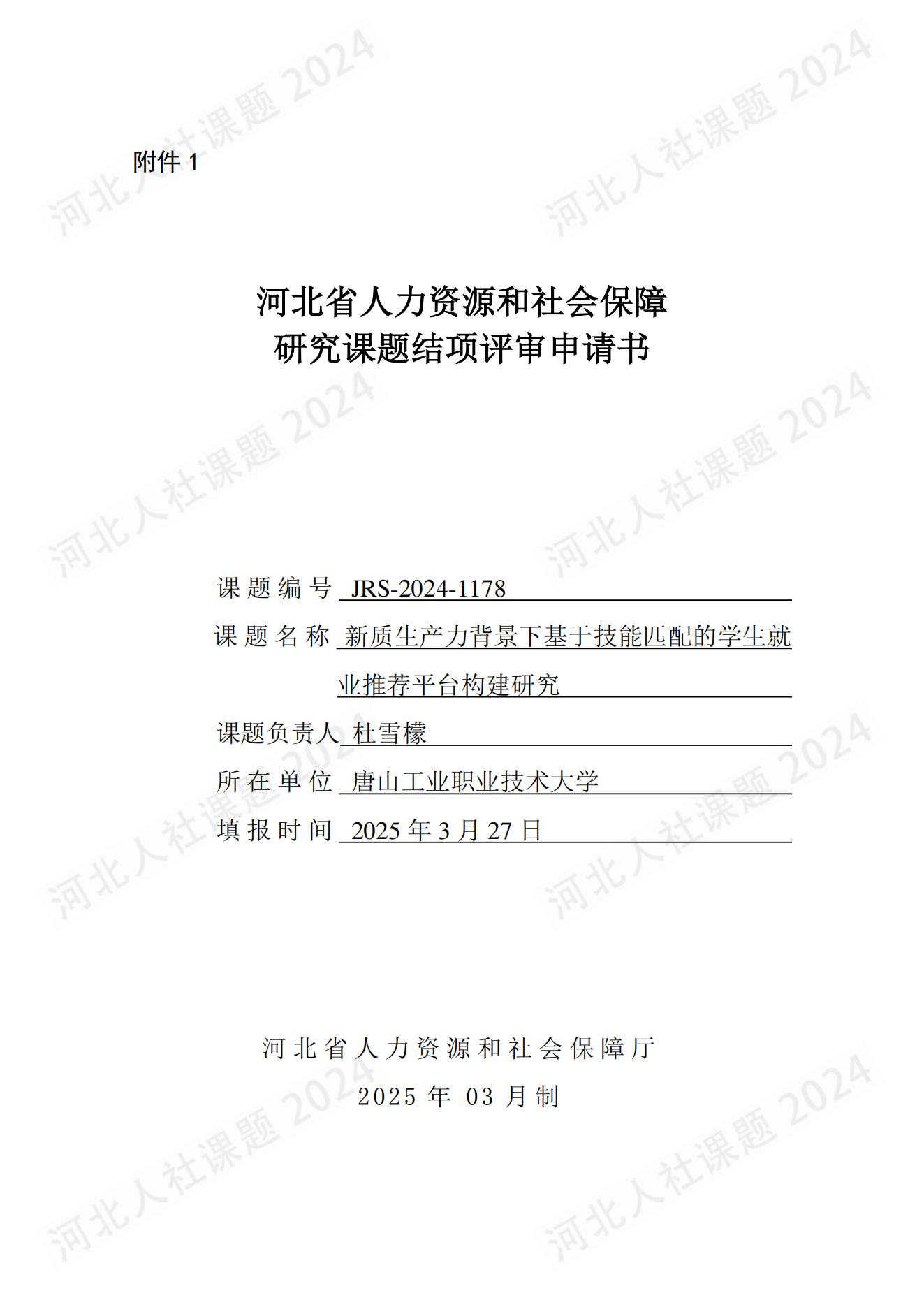 杜文萍主要参与河北省人力资源和社会保障厅研究课题,项目名称:《新质生产力背景下基于技能匹配的学生就业推荐平台构建研究》课题编号:JRS-2024-1178,获批单位:河北省人力资源和社会保障厅(已结题)